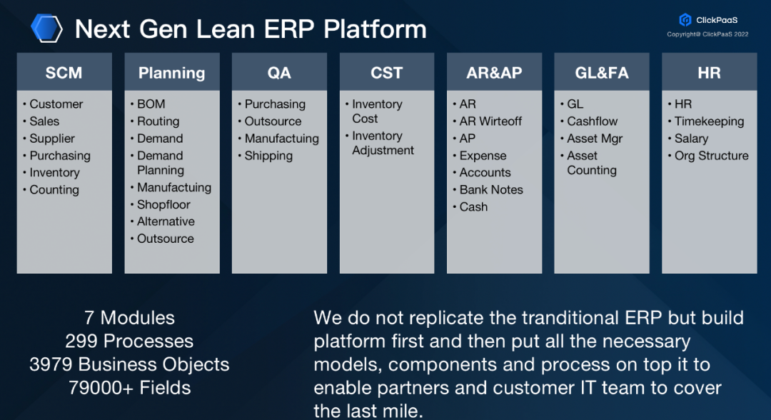 爱游戏全站app官网入口把这样的逻辑同样应用到了工业领域。比如在纷繁复杂的泛ERP场景中,爱游戏全站app官网入口把ERP场景中的核心模型内置在元数据模型平台上,并不是复制一个传统ERP,而是把核心的模型、组件、流程开放性的构建完善,支持爱游戏全站app官网入口的伙伴和客户通过一个瘦身的Lean ERP Platform进行扩展开发的逻辑构建最后一公里的业务实现。